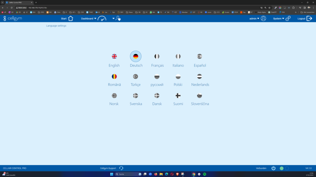 To switch the software to a different language during the initial setup, simply click on the corresponding country flag in the „System“ -> „Language“ menu: